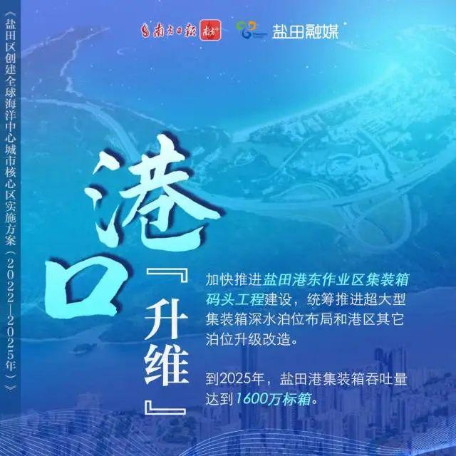 高水平建设盐田临港产业带,港口型国家物流枢纽和国际航运枢纽地位持续巩固和加强,离岸贸易中心建设成效初显。到2025年,盐田港集装箱吞吐量达到1600万标箱。