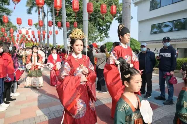 在大巡游中,醒狮献瑞、财神福禄寿送福、汉服巡游彰显着中国范、民族风。