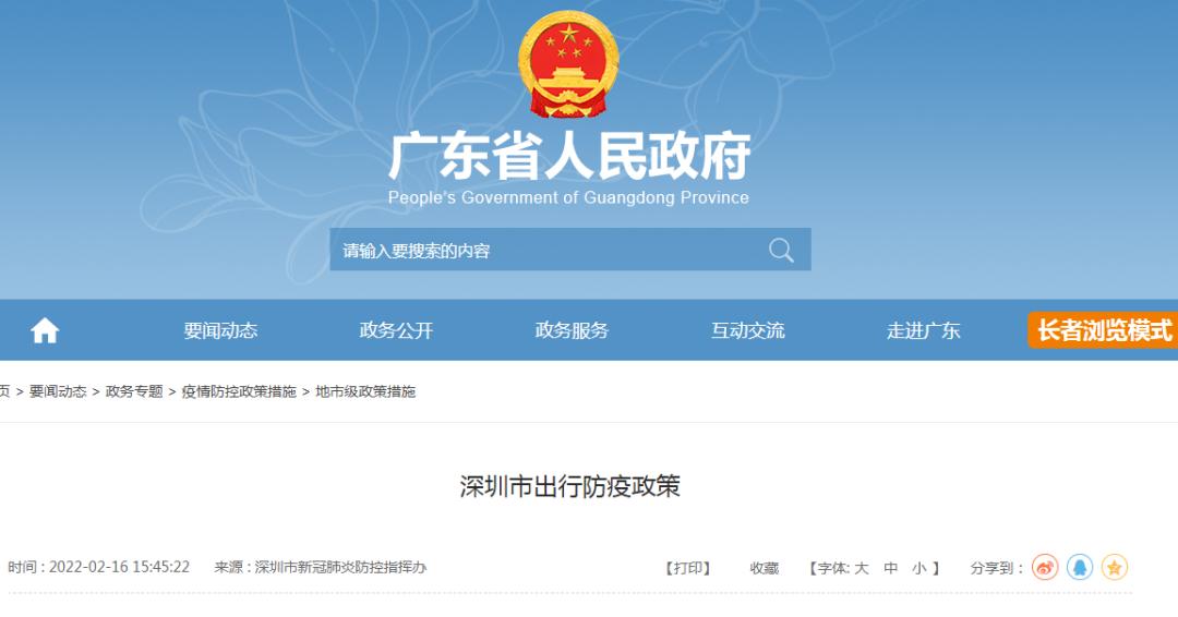 (https://www.gd.gov.cn/gdywdt/zwzt/yqfkzccs/dszc/index.html)、微信“国务院客户端”小程序(“各地防控政策”—“进入深圳”进行查询)、中国政府网各地疫情防控政策