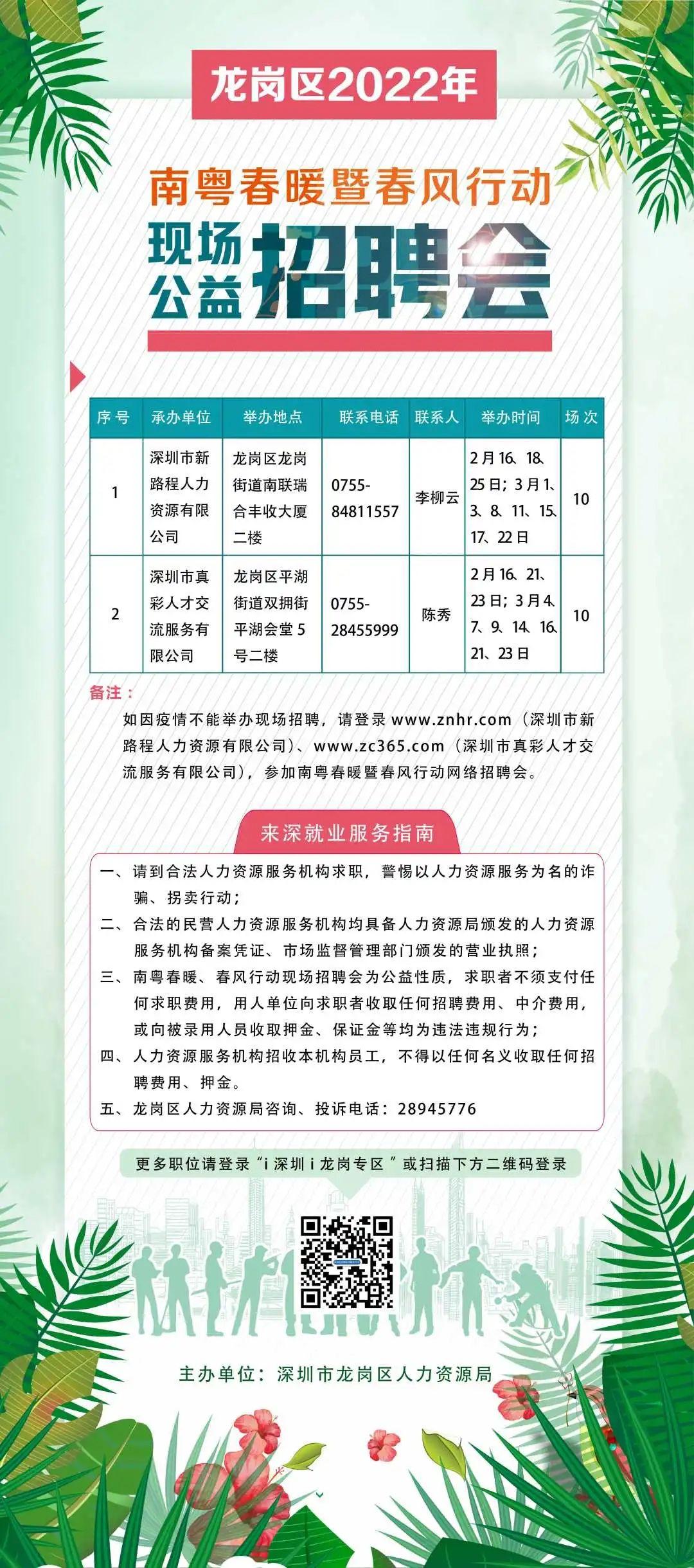 深圳市龙岗区人力资源服务中心于2月16日(星期三)上午9:00启动2022年“南粤春暖”暨“春风行动”系列公益招聘活动,线下招聘会共计20场!