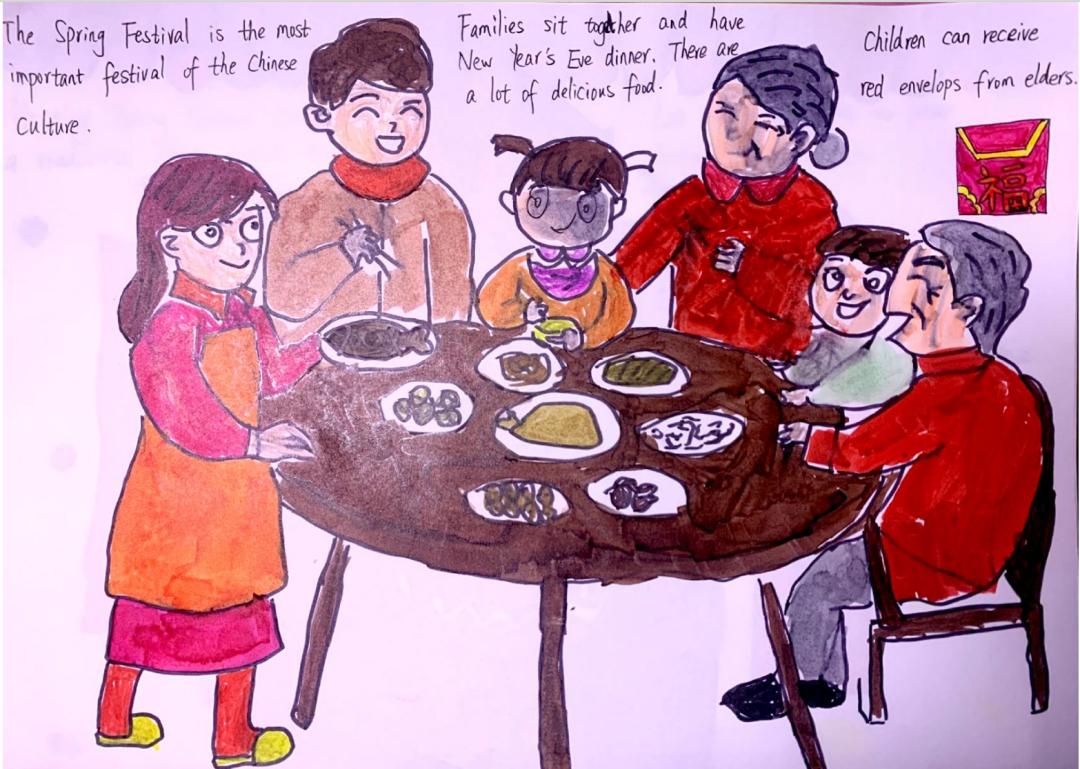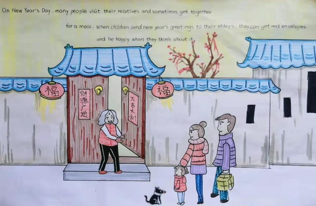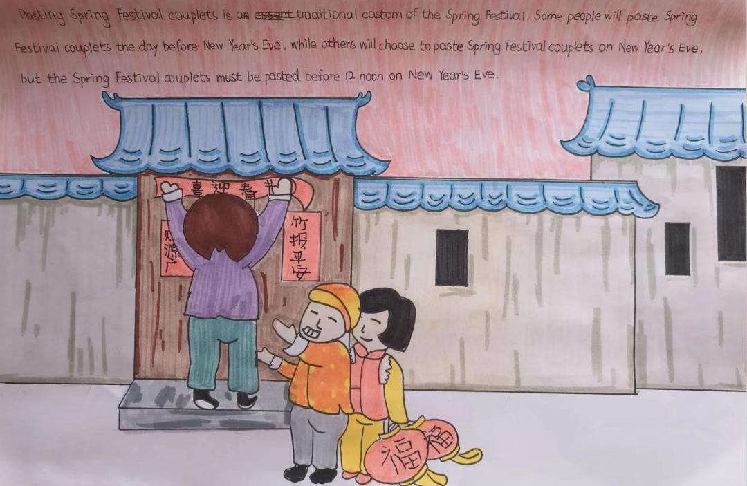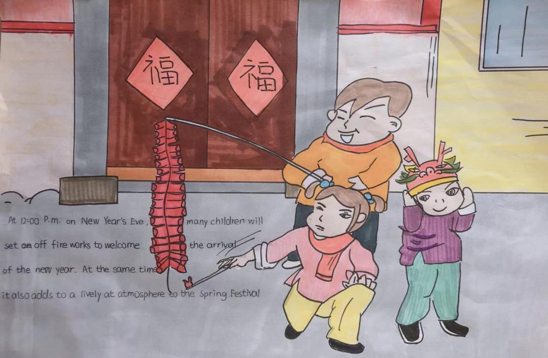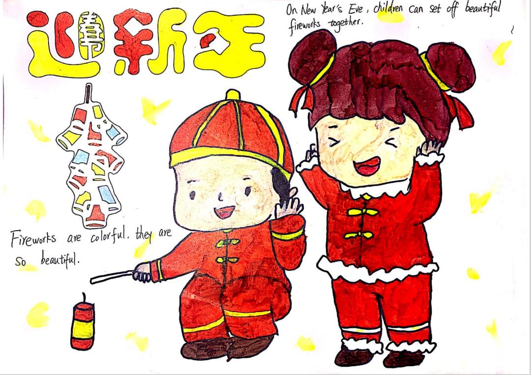 日色降落时,万家团圆。贴春联,燃鞭炮,放烟花,新年在欢声笑语中愉快度过,这是麓城外小学子眼里最温馨的年味,也是童年最美的记忆,他们用自己的巧手绘出了灯笼,“福”字门贴,也用绘本记录下了新年的欢愉。