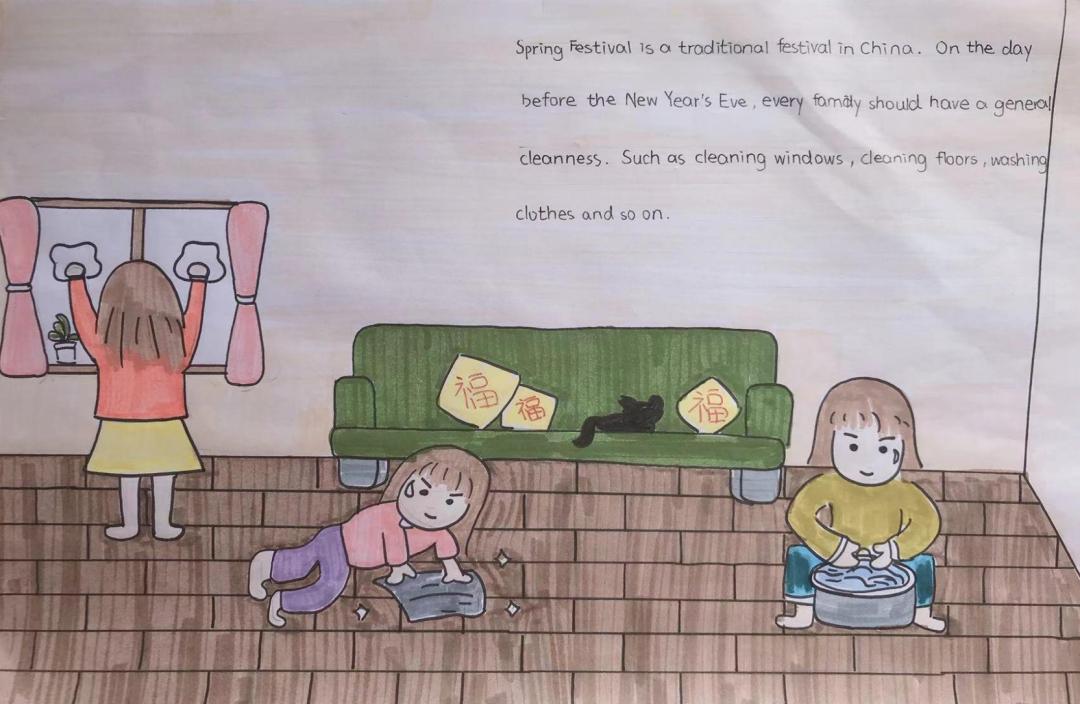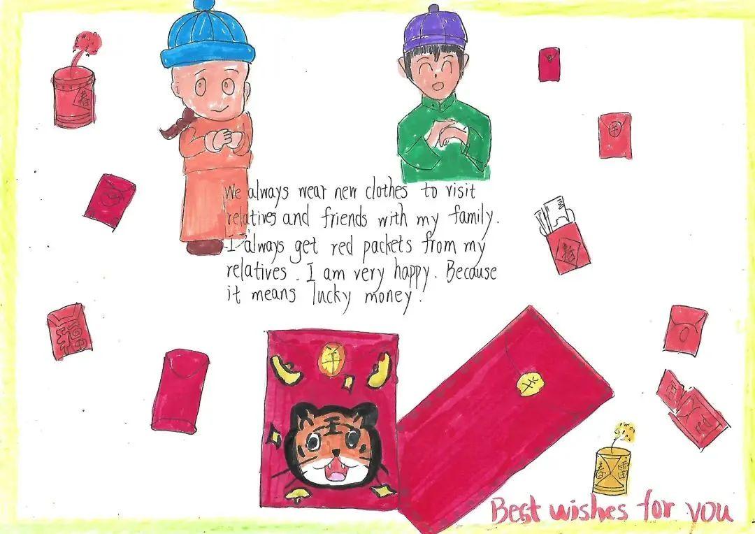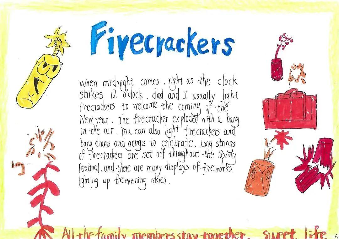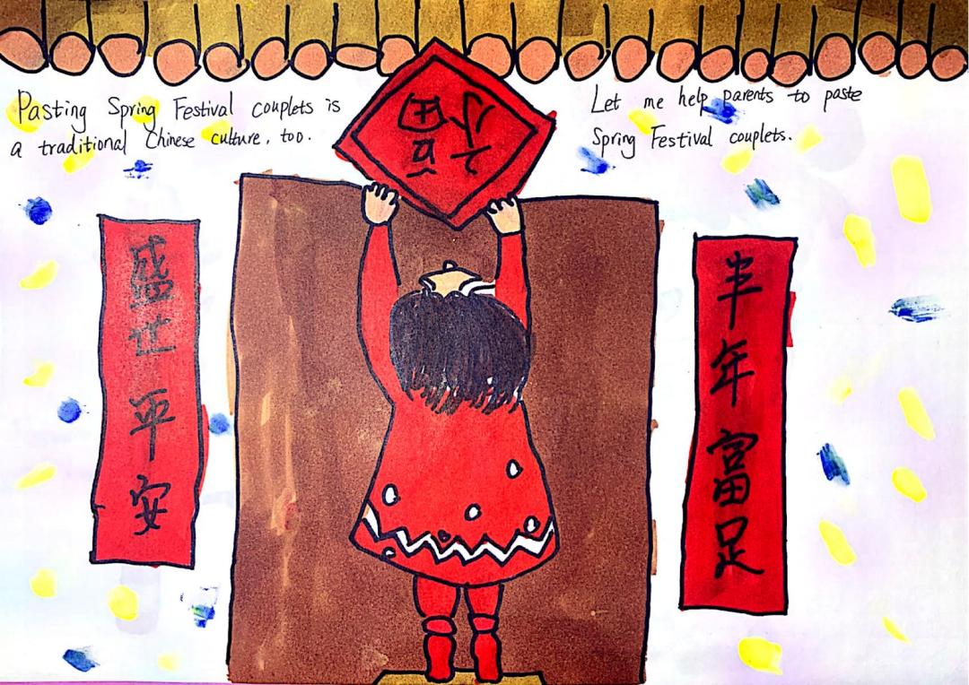 日色降落时,万家团圆。贴春联,燃鞭炮,放烟花,新年在欢声笑语中愉快度过,这是麓城外小学子眼里最温馨的年味,也是童年最美的记忆,他们用自己的巧手绘出了灯笼,“福”字门贴,也用绘本记录下了新年的欢愉。