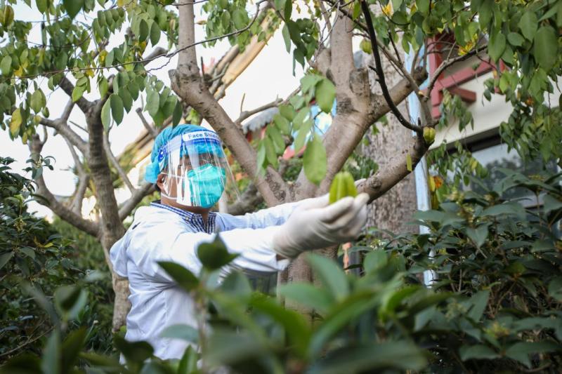宝石园艺负责人刘瑞是市场里少数不需要集中隔离的商户之一。2月14日下午,他来到邻居花满蹊园艺的店铺前,从一棵高大的杨桃树上摘下十几只果子,送给了一位穿着防护服的工作人员,“这些杨桃是在树上自然熟的,口感好,商户让我送给你们,你们辛苦了!”