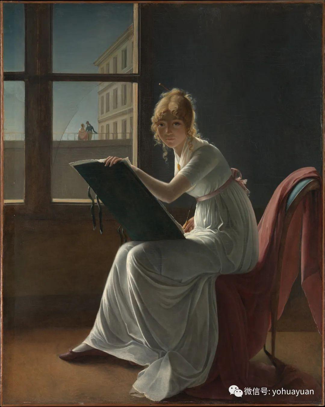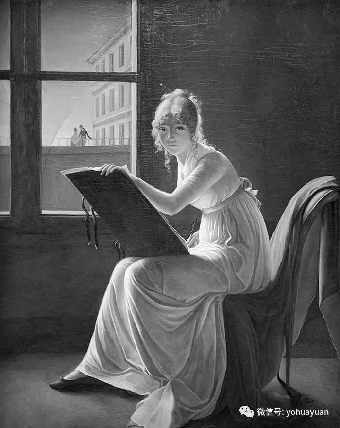 让我们仔细看看这幅画,它描绘一个年轻女子坐在一个房间里,手里拿着一个画板。她回头看着我们,仿佛我们就是她画的对象。
