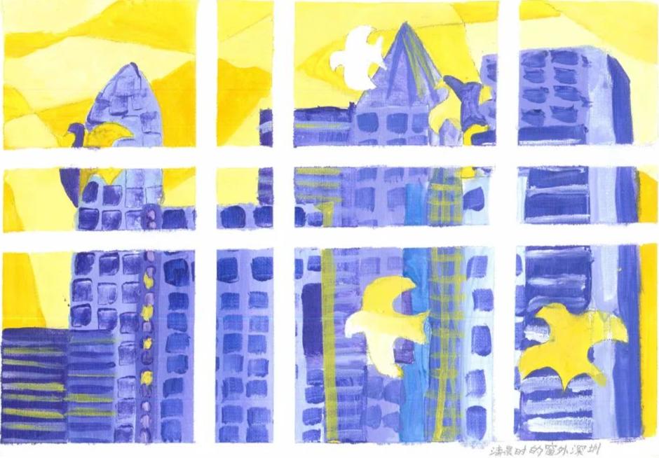 陈子懿 / 9岁 /《清晨时的窗外深圳》/ 30cm×40cm / 丙烯 / 2022年
