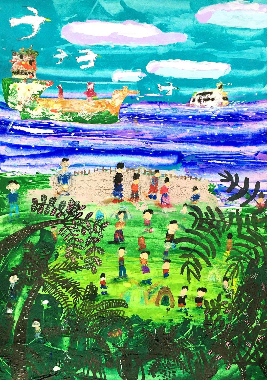 蔡旻芝 / 9岁 /《海边游玩》/ 54.6cm×38.9cm / 水粉画 / 2022年