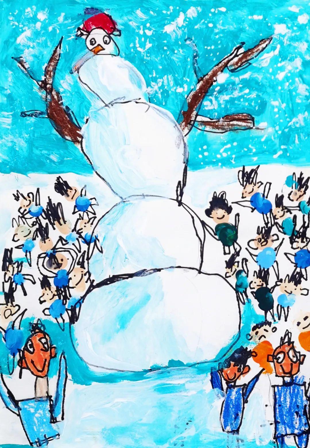 张睿 / 6岁 /《堆个大雪人》/ 26cm×37cm / 水粉画 / 2022年