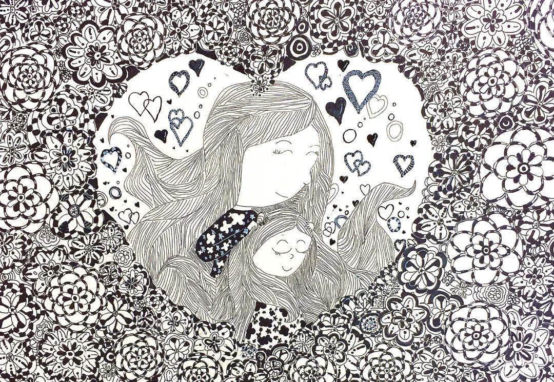 魏岳琳 / 9岁 /《爱的抱抱》/ 38.9cm×54.6cm / 黑白线描 / 2022年