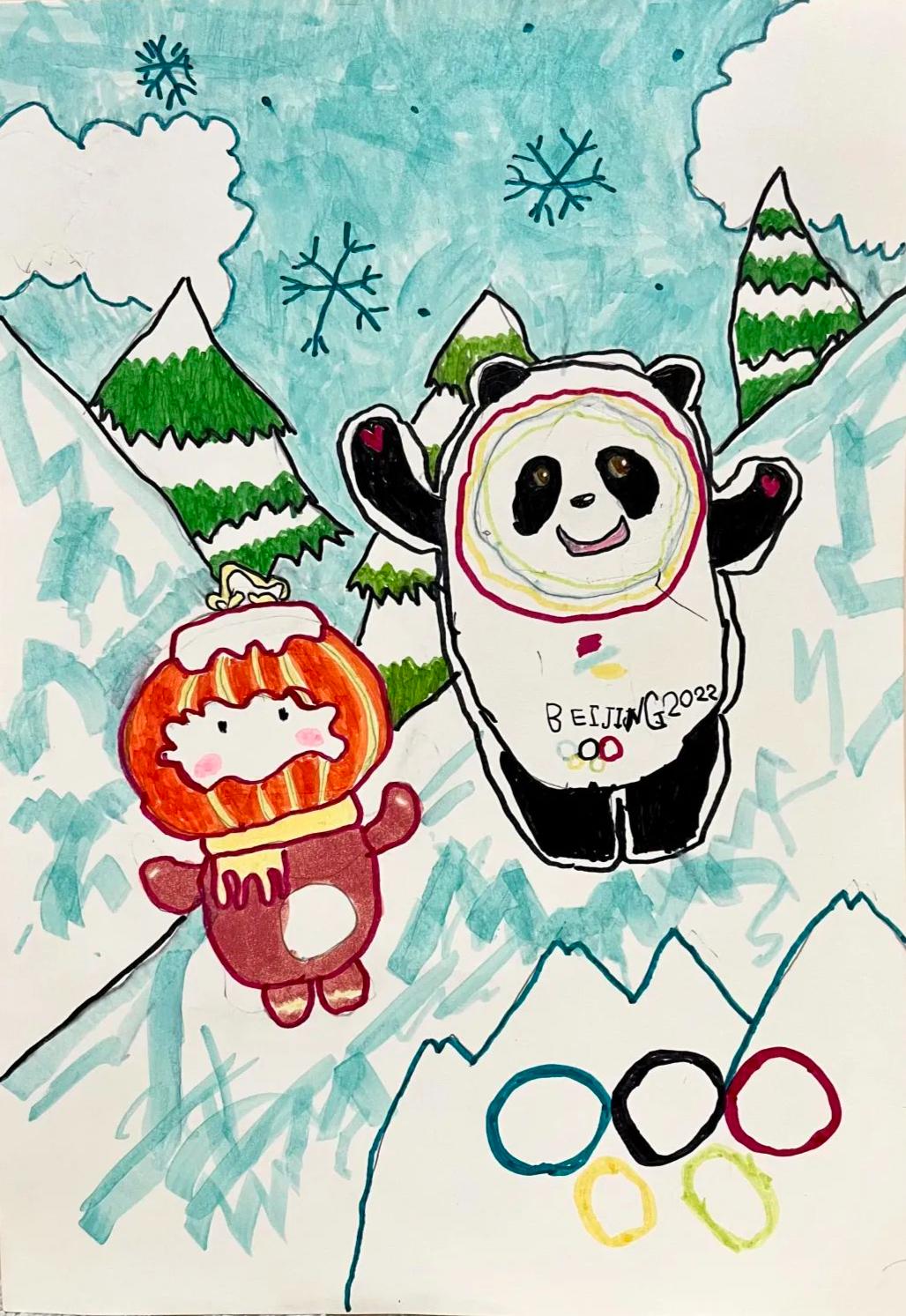 王艺霖 / 4岁 /《冰墩墩雪容融迎冬奥》/ 29.6cm×21cm / 纸本绘画 / 2022年