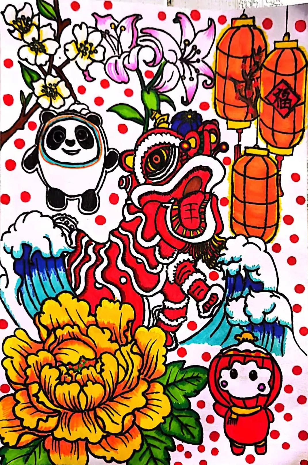 陈开域 / 11岁 /《我与冰墩墩舞狮》/ 21cm×29.7cm / 水彩笔画 / 2022年