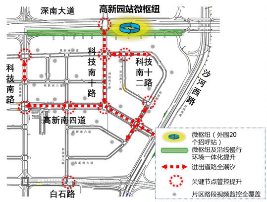 以科技园片区(深南-沙河西-白石-科技南围合区域)为试点,针对科技南、高新南一道等13条合计约6.9km道路,综合实施“公交提升、管控提升、停车治理、慢行提升”等手段,系统缓解片区拥堵问题,打造以人为本的综合交通服务提升示范标杆,为科技园长期拥堵治理提供典范。