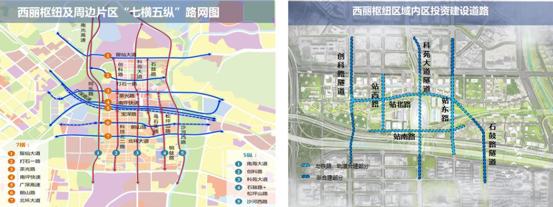 西丽枢纽及周边片区道路建设项目由区投资建设共有17项,投资规模约117.57亿元,包括南海大道西丽枢纽段、茶光路西丽枢纽段、科苑大道隧道等道路新建、改造工程。
