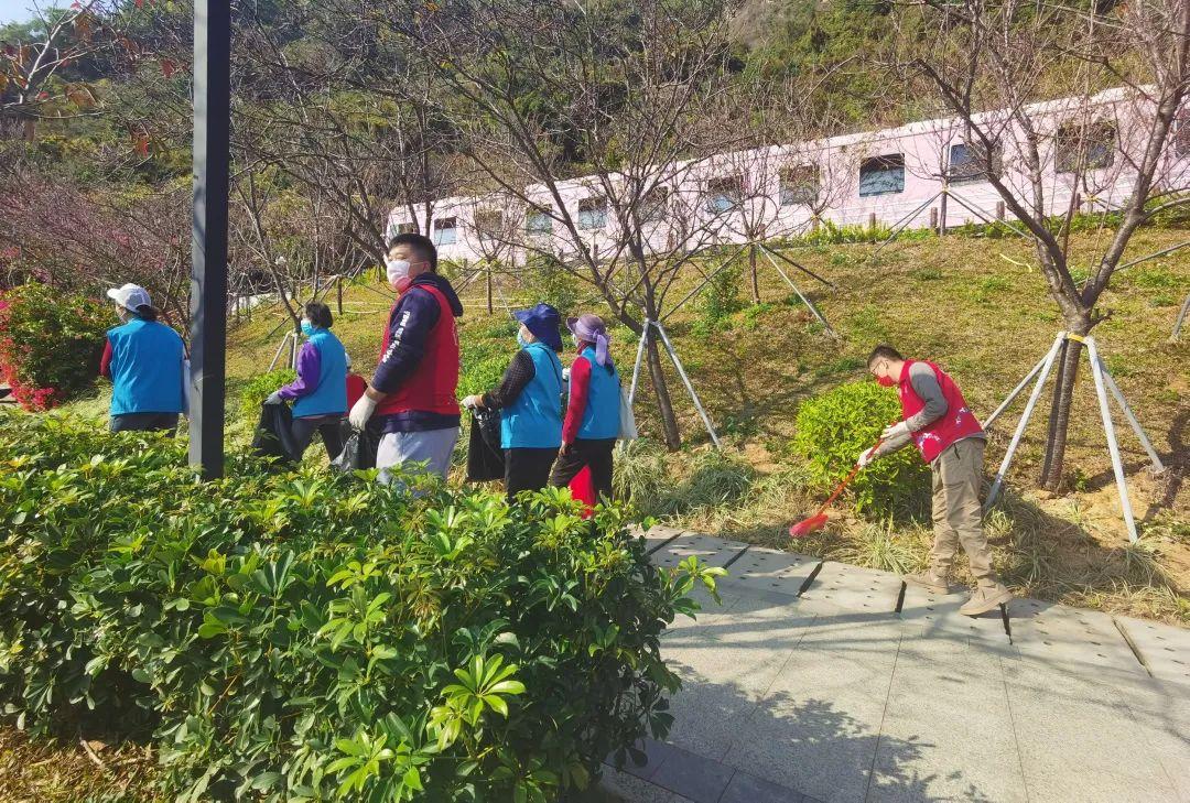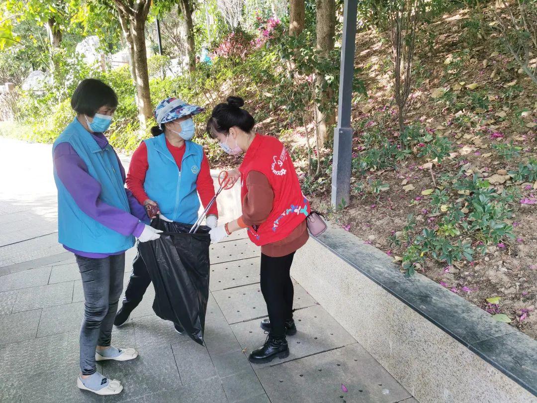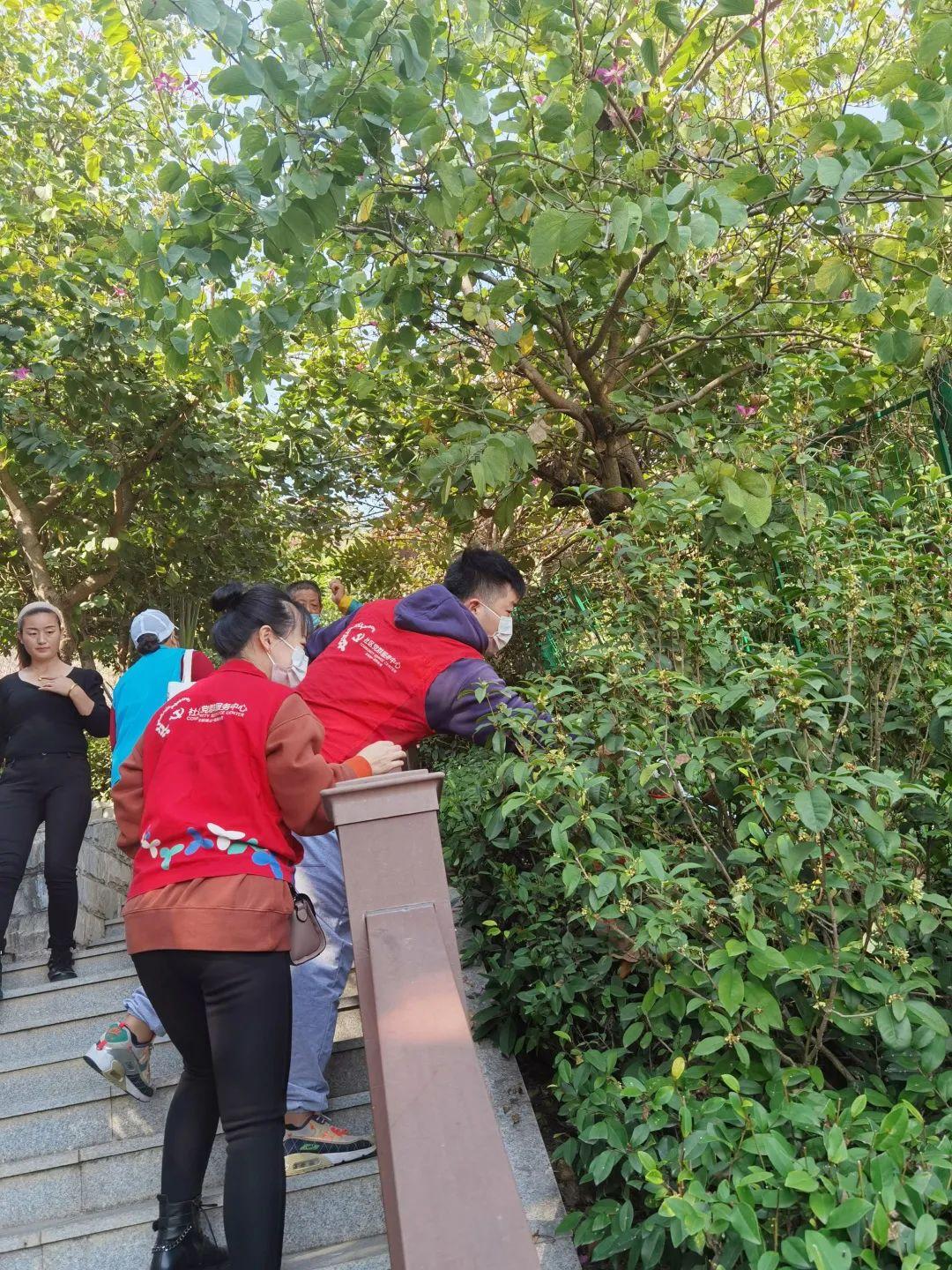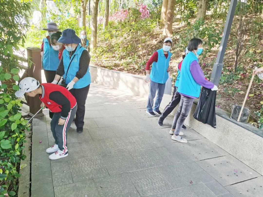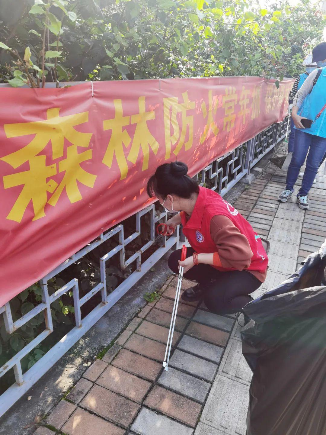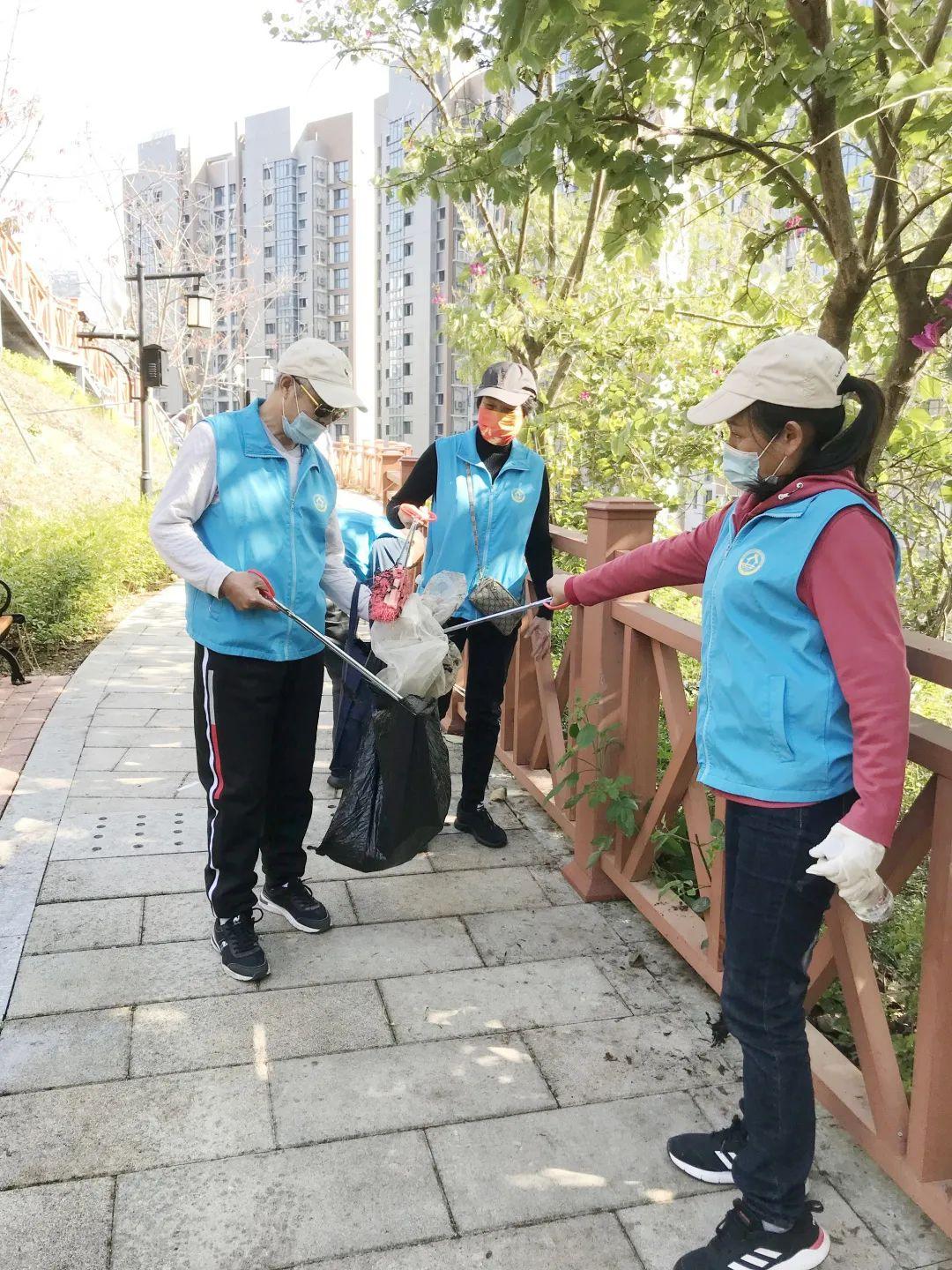 在公园,忙碌的“红马甲”与“蓝马甲”形成了另一道亮丽的风景线。大家齐心协力,干得是热火朝天,专心致志地打扫,不放过任何一处垃圾。