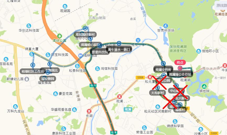 往观澜湖公交总站方向取消“松元公园”1个单边公交停靠站,增加“观澜爱心家园、库坑围仔新村、福安雅园北、福安雅园、桔塘社区工作站”等5个单边公交停靠站。