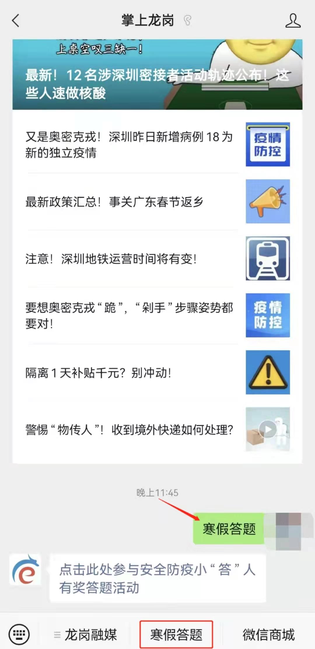 ②在“掌上龙岗”微信公众号后台发送关键词【寒假答题】或点击公众号子栏目【寒假答题】参与活动。