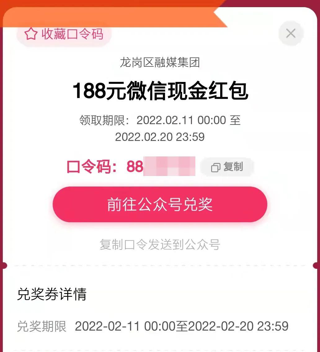 ➤如图所示,将口令码发在“掌上龙岗”微信公众号后台就能领取现金红包啦~