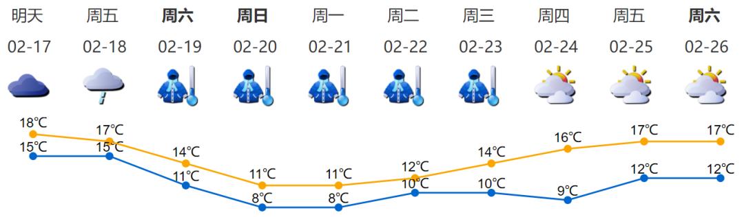 ●2月17日,多云转阴天,偶有零星小雨,气温15—18℃,东风3—4级,沿海、海区和高地最大阵风7—8级,相对湿度65%—95%。2月18日,阴天,有小雨,气温15—17℃。2月19日,阴天有小雨,日温差小,天气阴冷,气温11—14℃。