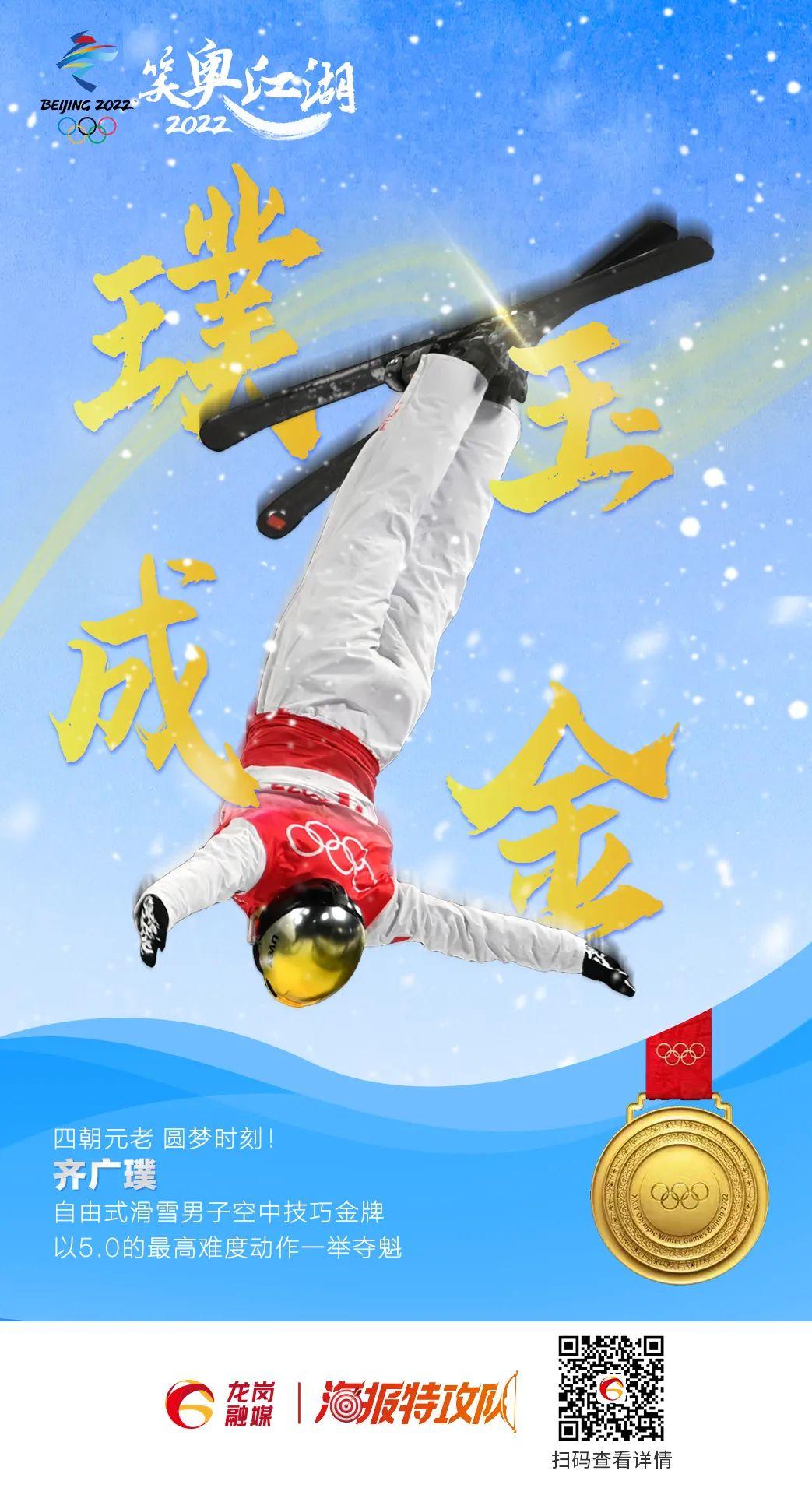 2月16日晚,北京冬奥会自由式滑雪男子空中技巧决赛中,齐广璞做出5.0最高难度动作,以129.00分排名第一,为中国代表团赢得第七枚金牌。
