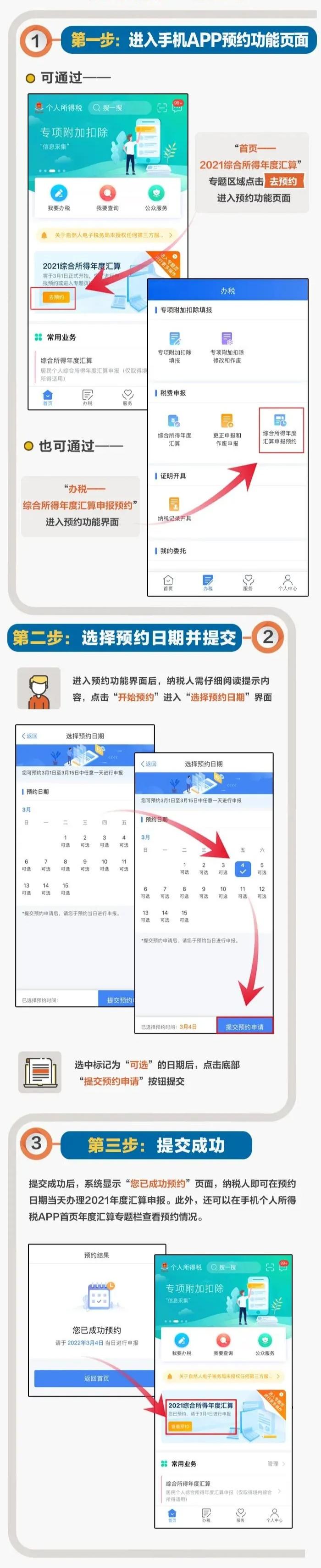 纳税人如需在3月1日至3月15日之间办理年度汇算,可在2月16日至3月15日每天的早6点至晚22点登录手机个人所得税APP进行预约。