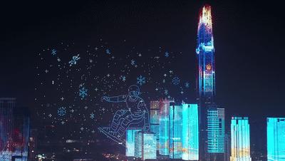 2022架无人机编队在深圳市民中心缓缓升起,它们在空中组成漫天“雪花”,与楼宇灯光秀交相辉映;它们变幻为冬奥吉祥物冰墩墩和雪容融从夜空中款款而来;它们组成2022北京冬奥会会徽高悬夜空;它们将市民对冬奥和美好生活的祝福语呈现演绎……