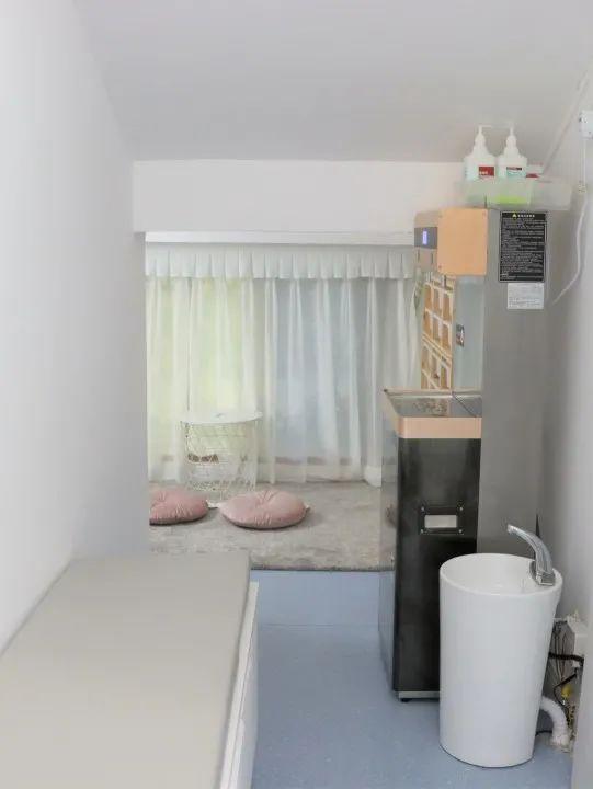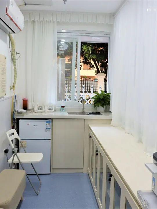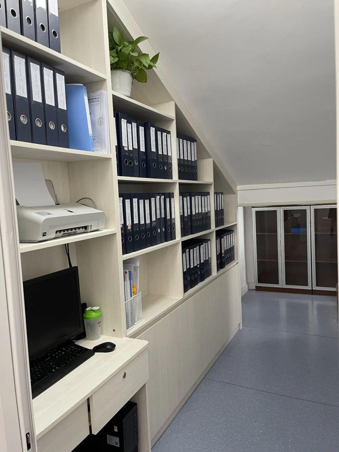 巧妙利用楼梯下方空间,增设保健室、隔离室。玻璃隔断、白色纱帘,可私密可开放;定制组合柜,功能多用,物品进柜,制度上墙,环境温馨整洁,更规范,更有序。