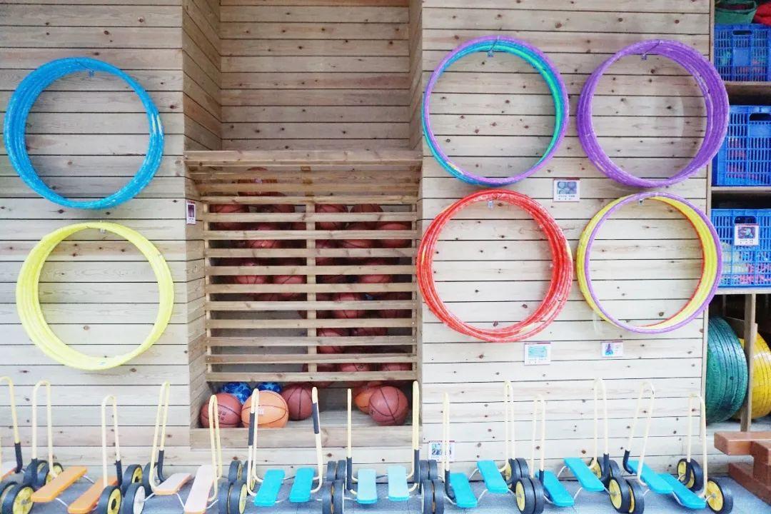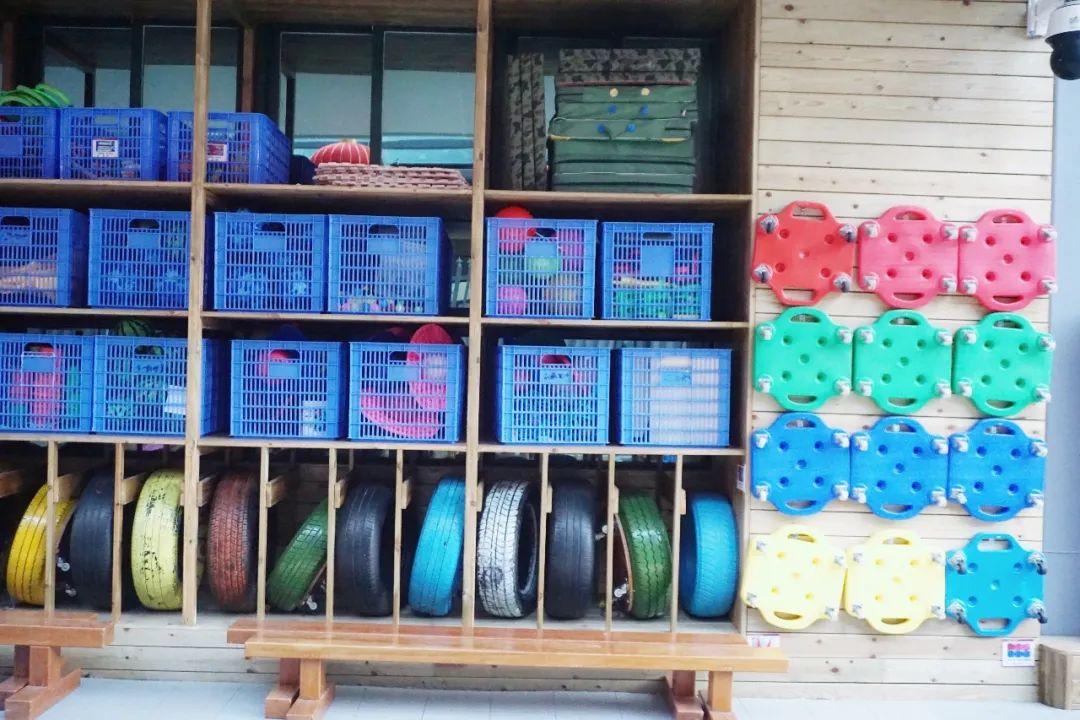 最底层放置轮胎可供幼儿自行取用,中间两层放置常用的小型体育器械,最上面一层的空间也充分利用,用于放置大件但较轻便的体育器材。