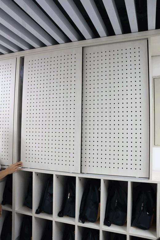 班级榻榻米打造成收纳柜。在柜门上安装透气孔,更好收纳幼儿午睡用床,给孩子留出更多活动空间。