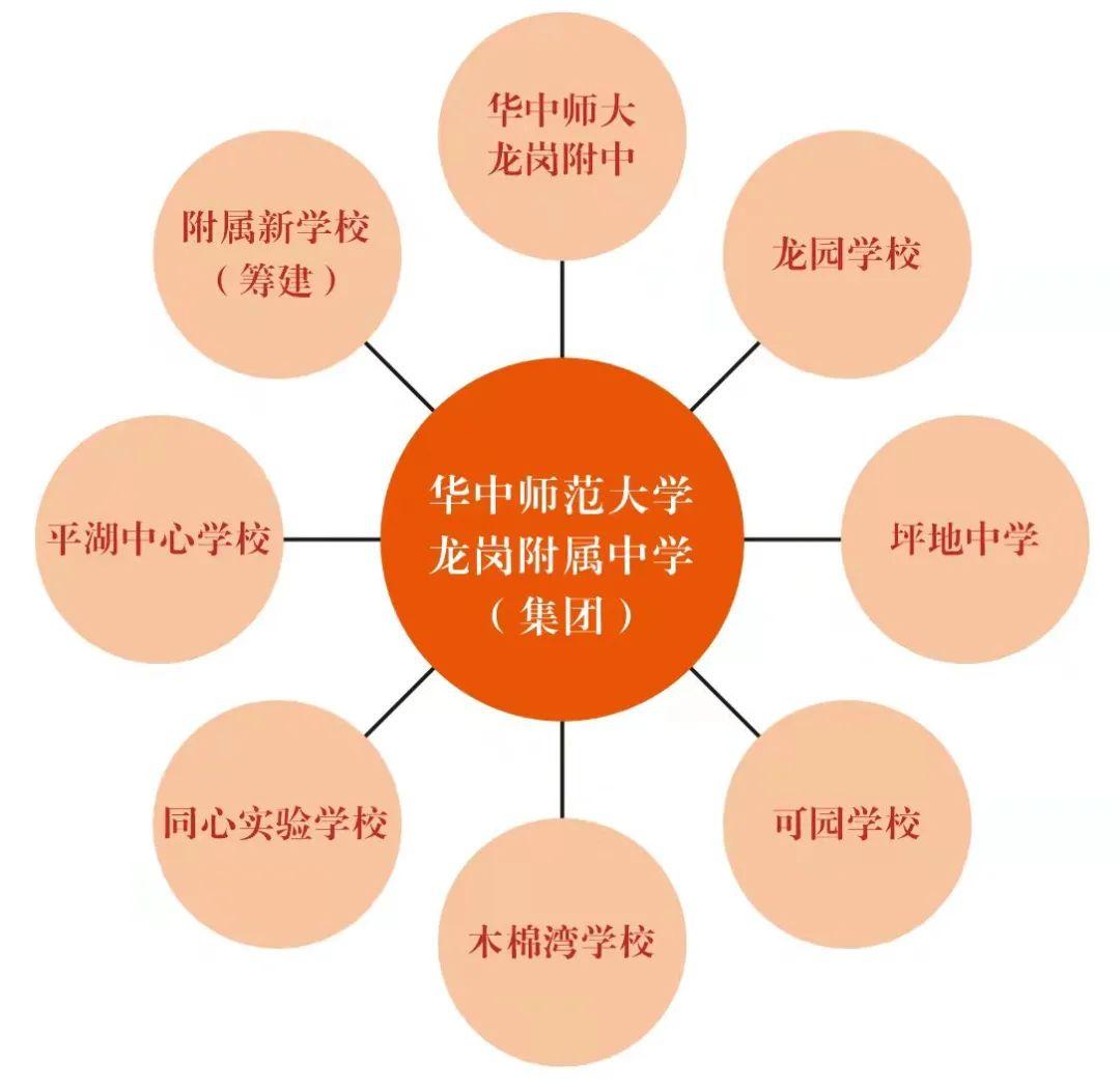 华中师范大学龙岗附属中学(集团)以华中师范大学龙岗附属中学为牵头校,华中师范大学附属龙园学校、坪地中学、可园学校、木棉湾学校、同心实验学校、平湖中心学校为成员校,形成“1+1+5+N”集团发展格局。覆盖布吉、坪地、平湖、龙岗、宝龙等街道,是龙岗区办学覆盖面最广的基础教育集团。