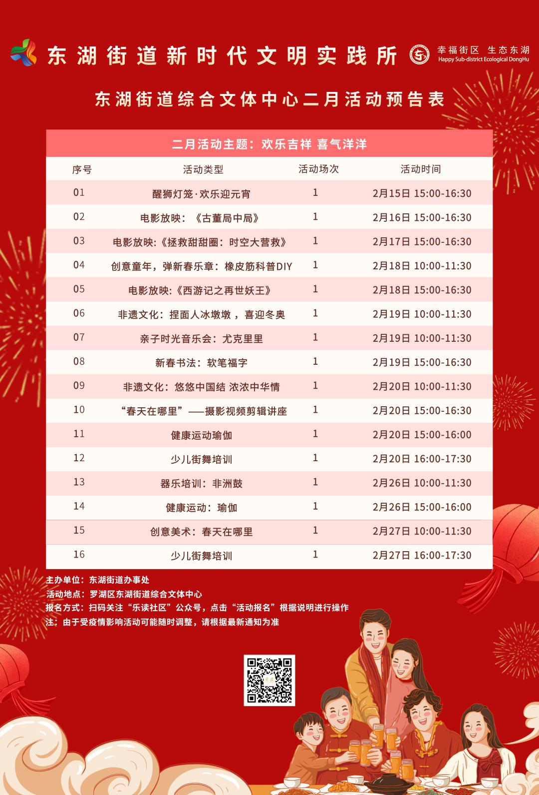 新年已经过完,但年味似乎犹存,东湖街道综合文体中心仍然是欢乐吉祥,喜气洋洋的氛围~醒狮灯笼、喜迎奥运冰墩墩、新春书法,是不是还有一丝年的余味呢?已至二月,草木复苏,万物始生,春天的气息氤氲开来,摄影视频剪辑讲座、创意美术,带你领略初春的气息……此外,电影放映、器乐培训等也在本月活动中,跟随小编一起来了解吧~