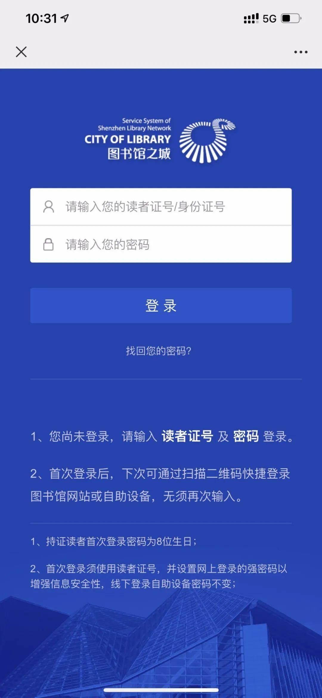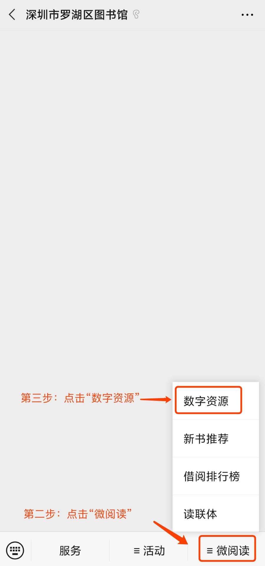 STEP1:进入我馆公众号页面后,点击右下角“微阅读”菜单中的“数字资源”,单击后将弹出读者证登录页面,读者按照要求输入读者证账号和密码。