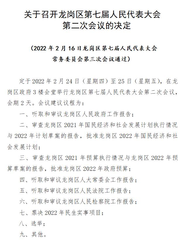 关于召开龙岗区第七届人民代表大会第二次会议的决定