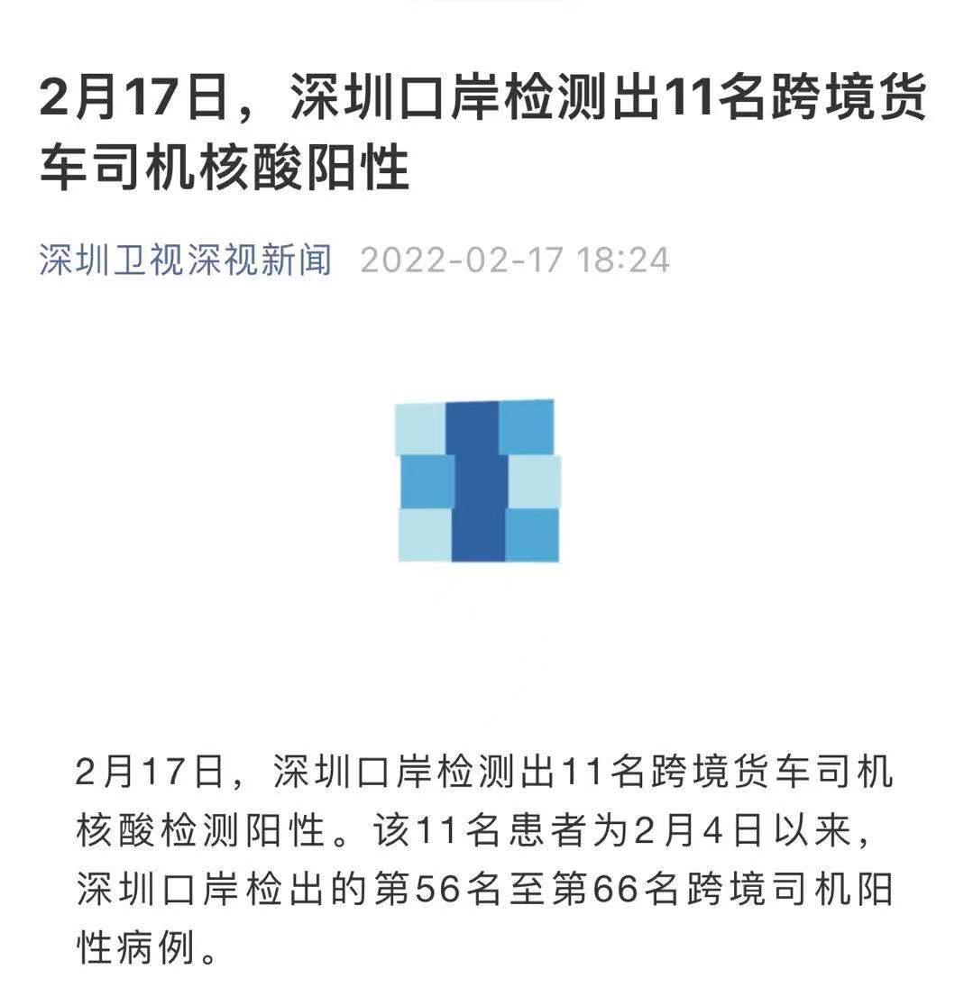 皇岗口岸接驳场接卫健部门通报跨境货车司机麦某核酸检测结果呈阳性(接报时麦某已返港),驾驶其车辆的内地接驳司机张某在南山区被管控,并转运至隔离酒店集中隔离。