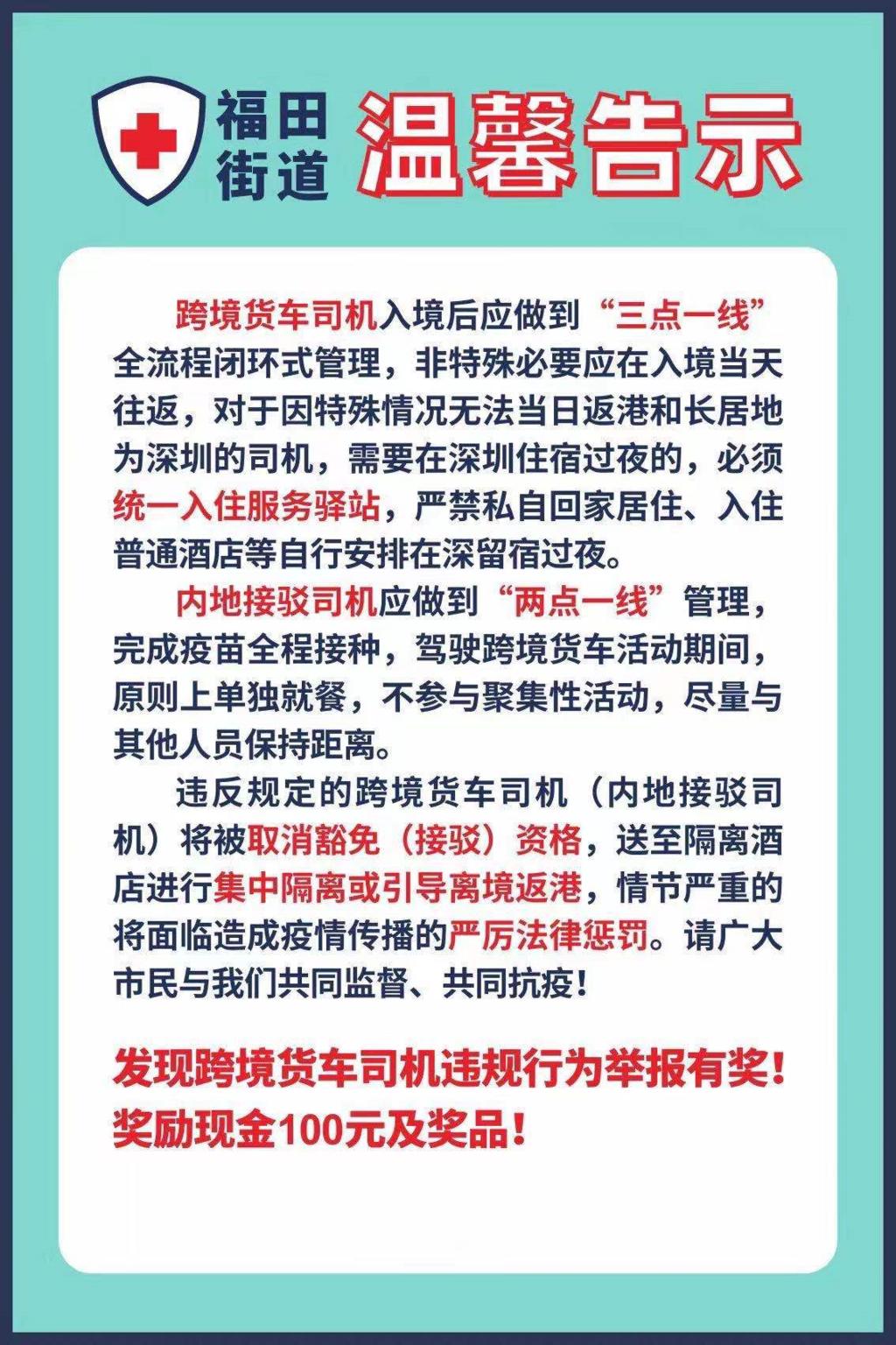 1月31日,皇岗社区接群众举报“跨境货车司机关某违规返回住所”,社区三人小组立即对其现场管控,开具《跨境货车司机违反疫情防控规定行为告知书》,将其转运至隔离酒店集中隔离14天,并取消其豁免资格,其同住人居家隔离14天。