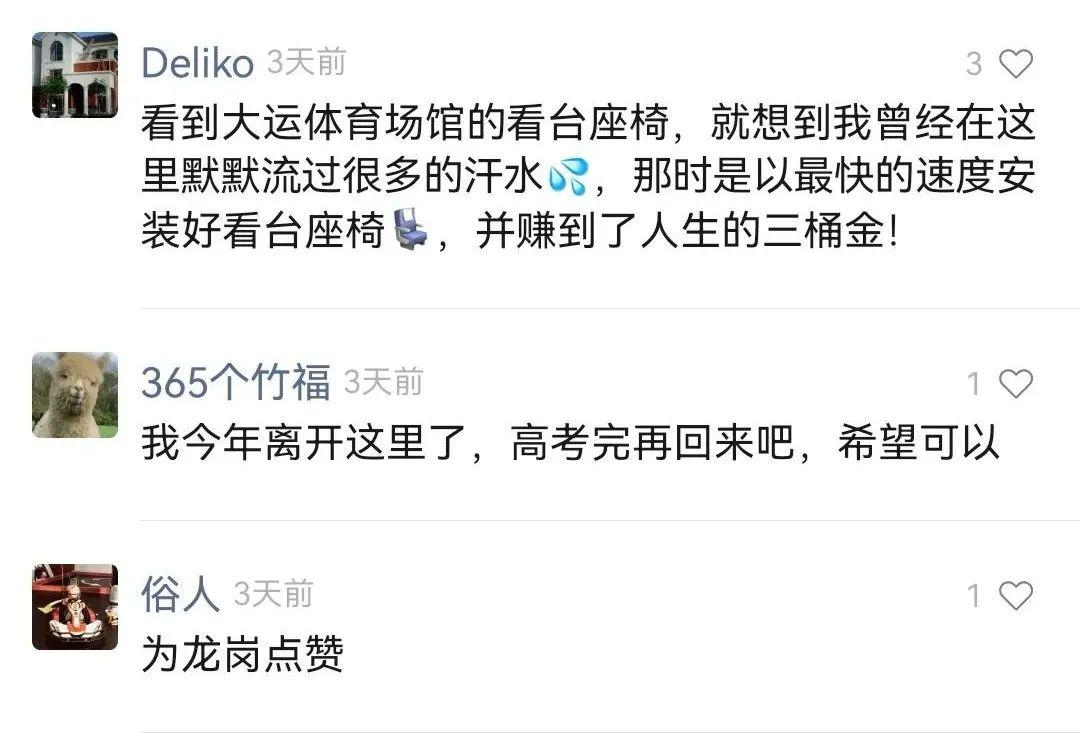 网友“Deliko”表示:“看到大运体育场馆的看台座椅,就想到我曾经在这里默默流过很多的汗水,那时是以最快的速度安装好看台座椅,并赚到了人生的三桶金!”
