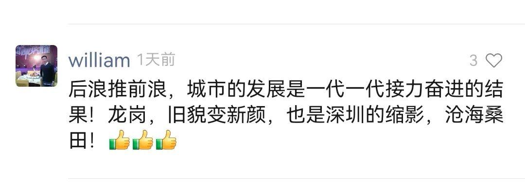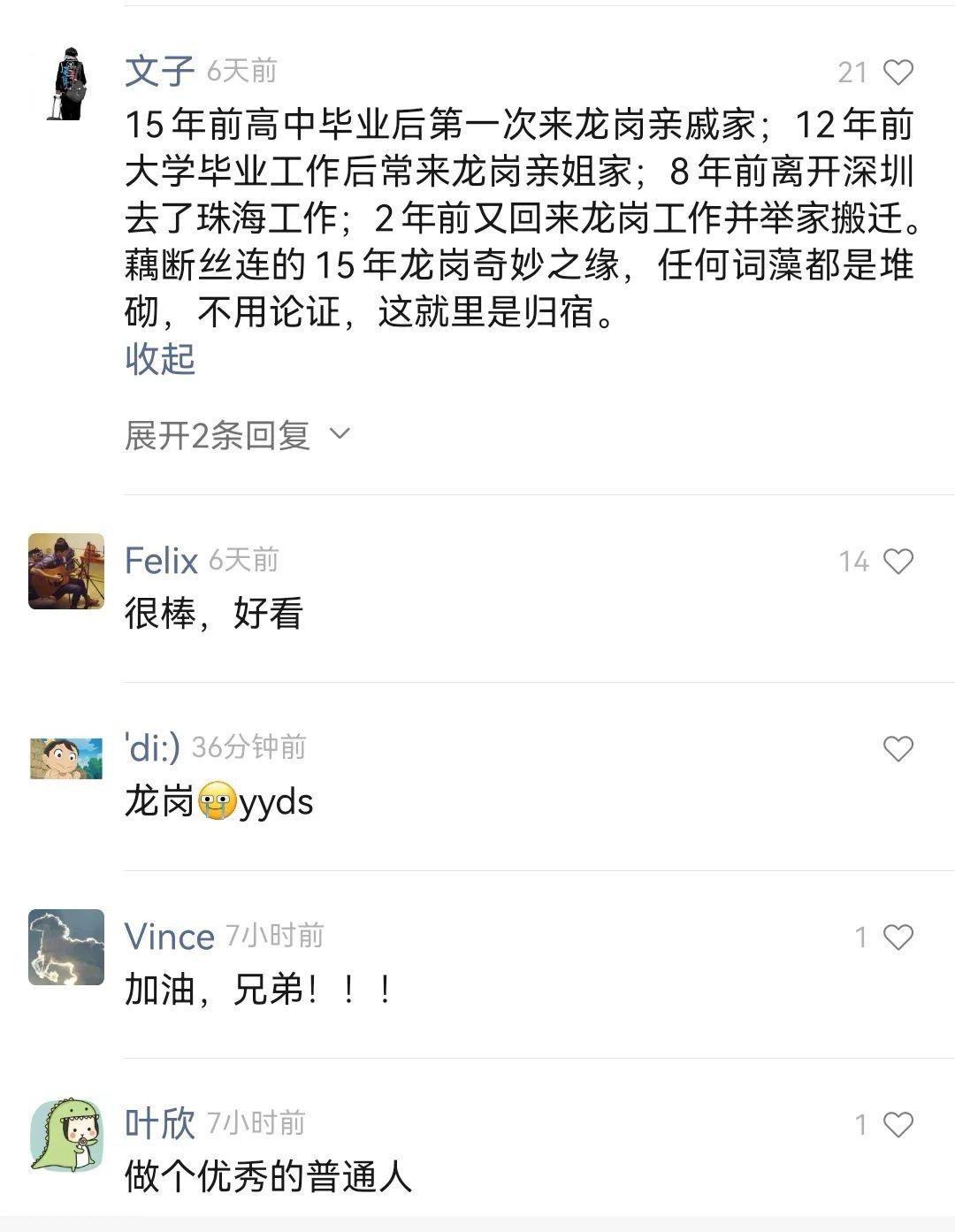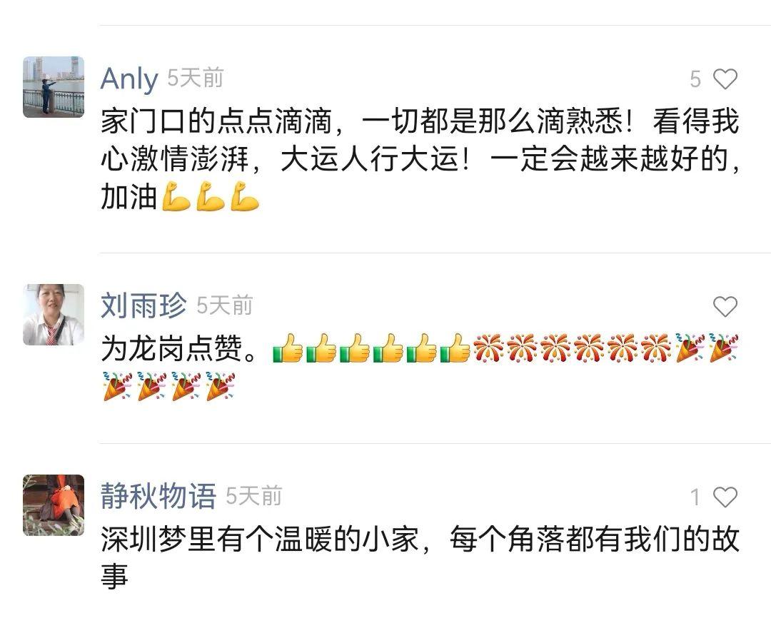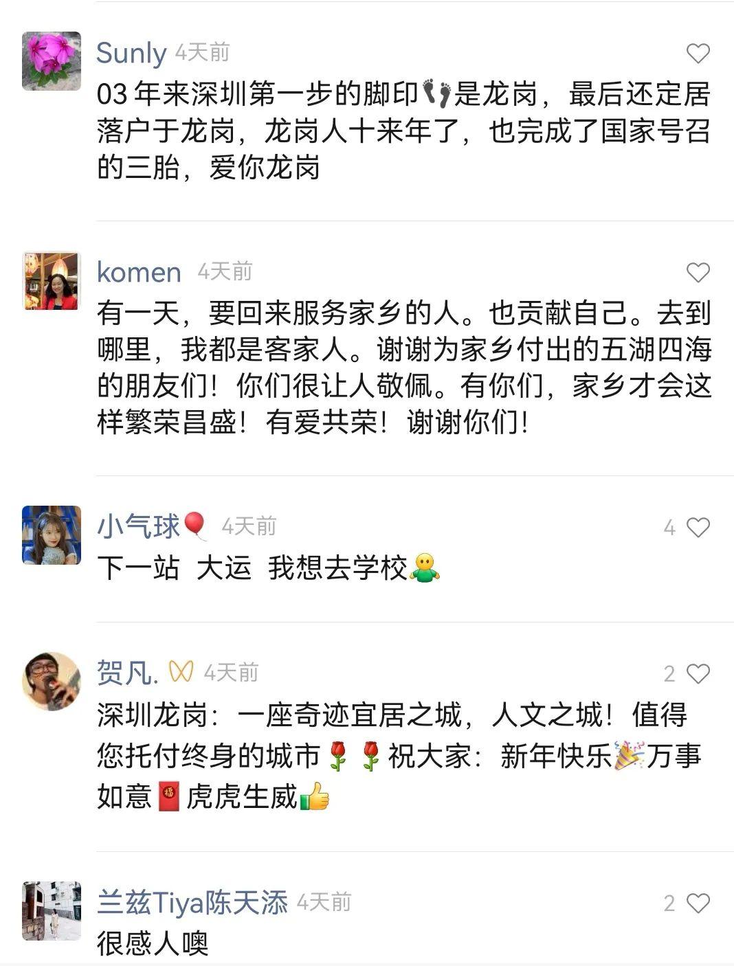 网友“livia luo”表示:“每次看正能量宣传,眼眶总有小湿润!在龙岗,勇敢向前!”网友“文子”则感叹:“15年龙岗奇妙之缘,任何辞藻都是堆砌,这里就是归宿!”