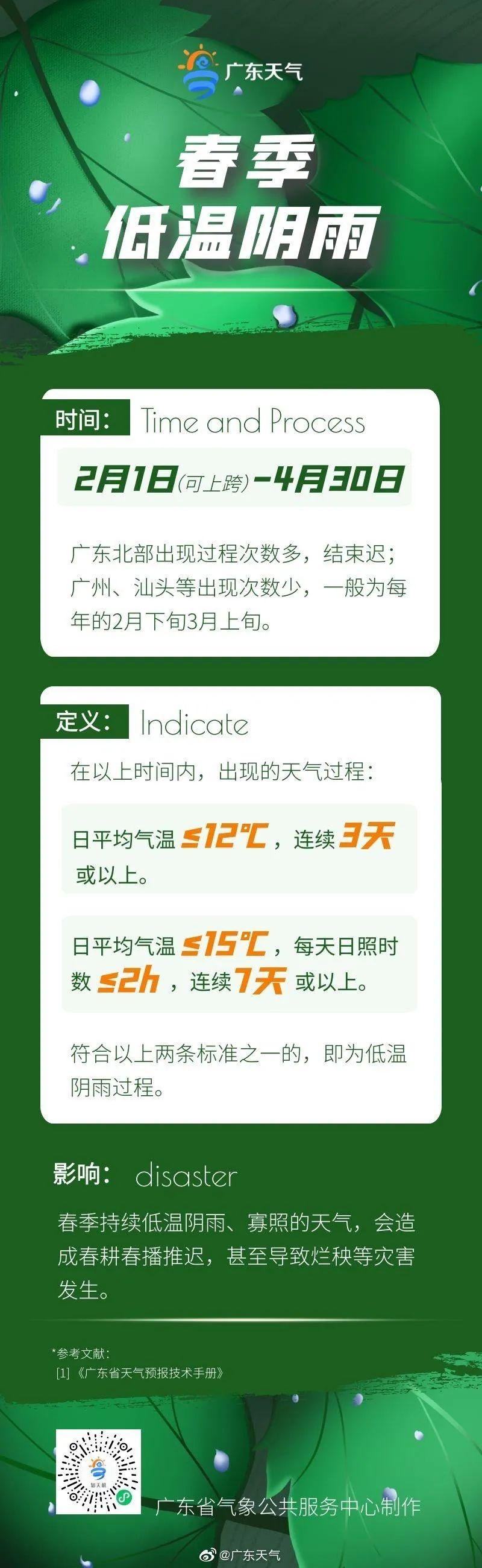 每年的2月1日至4月30日之间,日平均气温≤12℃,且持续天数≥3天的天气;或日平均气温≤15℃,每日日照时数≤2小时的天数连续≥7天的天气,即为低温阴雨过程。