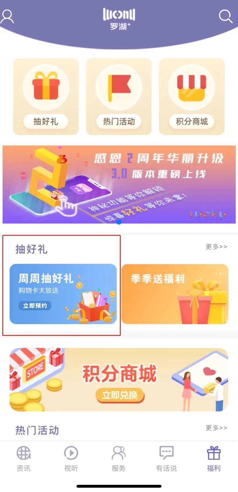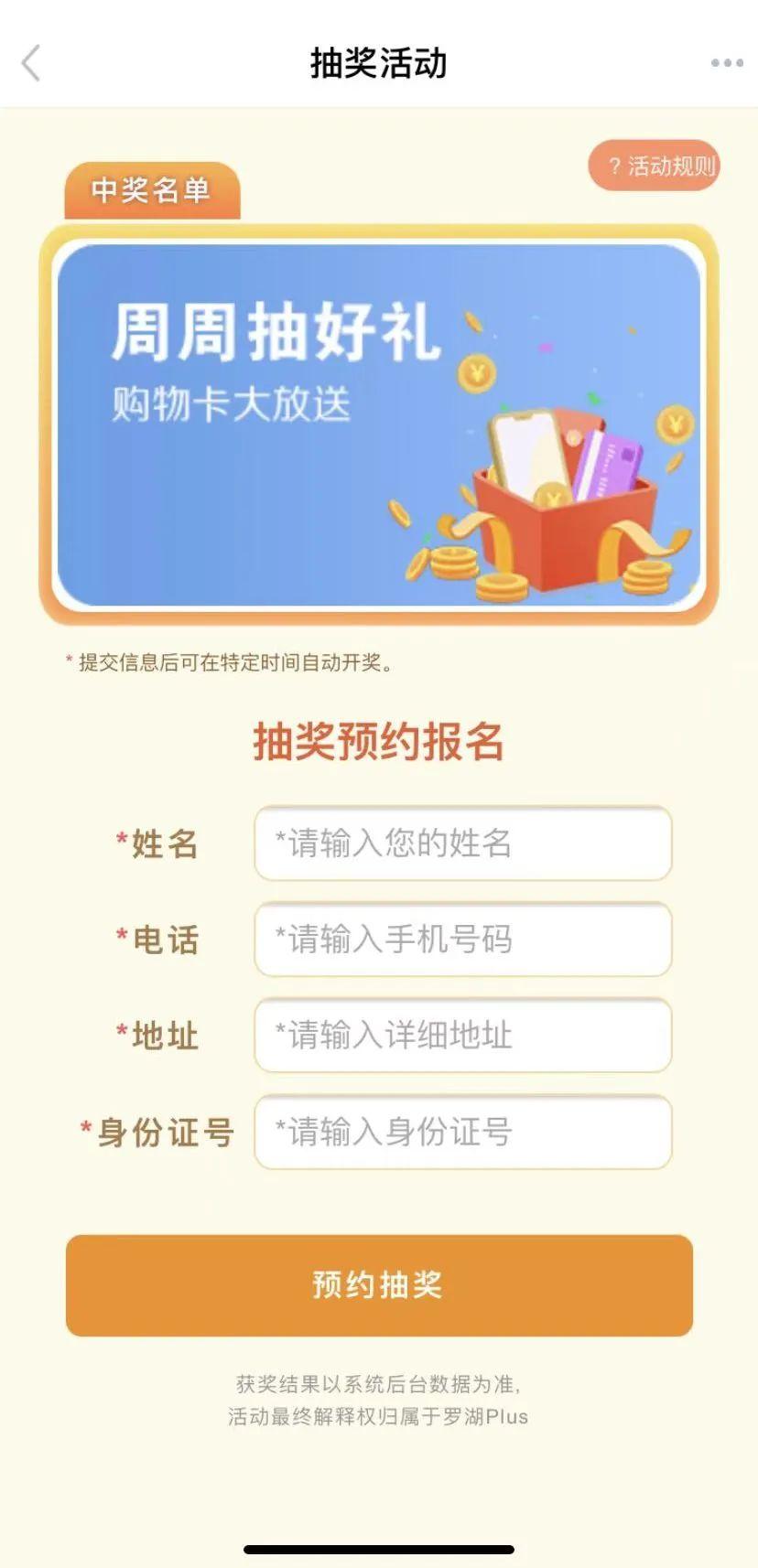 ②预约(即日起至2022年2月20日9:50):点击“福利”栏目-“周周抽好礼 购物卡大放送”,填写姓名、电话、身份证号后,点击“预约抽奖”即可。如果没有出现预约页面,小伙伴们可以重新登录一下~