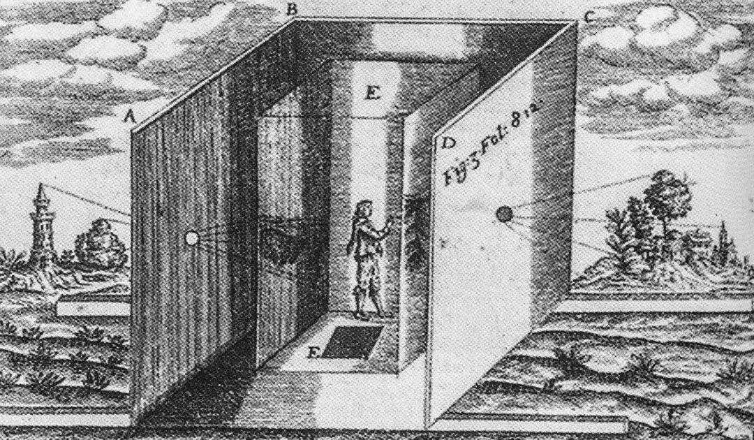 《大型便携相机暗箱》,1646年,雕版,阿塔纳斯·珂雪(Athanasius Kircher)