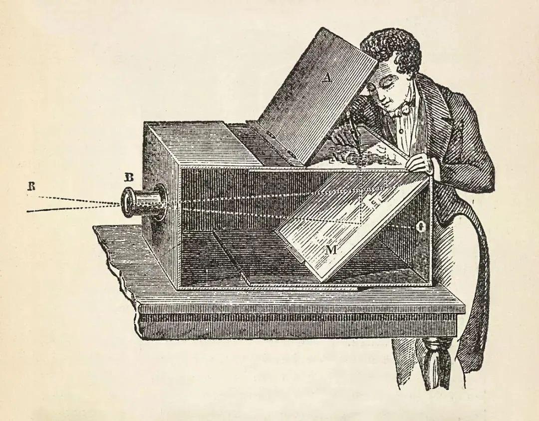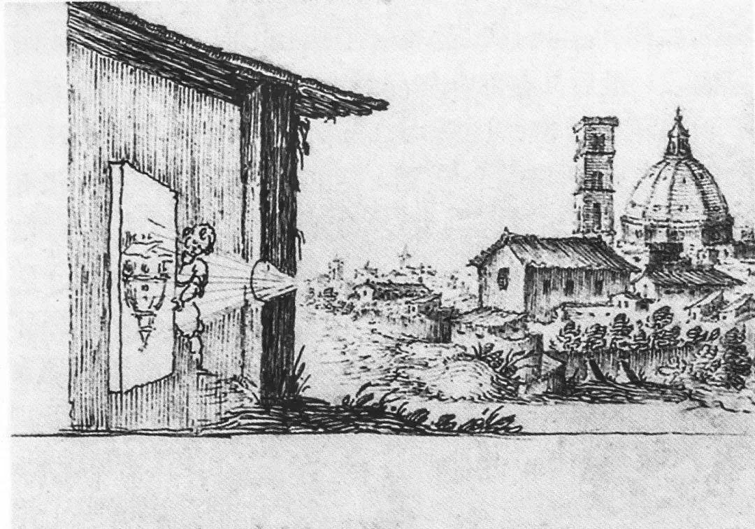 而在欧洲,15世纪意大利人L·B·阿贝尔第(Leon Batisti Alberti)研制出最初的暗箱,到了16世纪文艺复兴时期,出现了供绘画用的成像暗箱。成像暗箱的原理是小孔成像的“改进版”:景物透过镜头,进入暗箱中的45°反光镜,反光镜将其反射到暗箱上方的磨砂玻璃上,画家就在磨砂玻璃上铺上画布临摹作画。