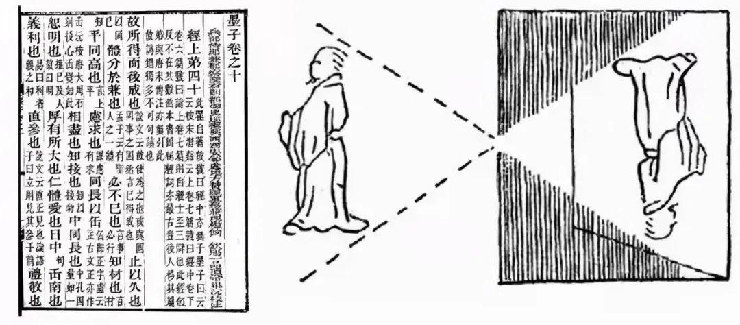 公元前四世纪,我国的《墨经》一书就详细记载了光的直线前进、光的反射,以及平面镜、凹面镜、凸面镜的成像现象:“景到,在午有端,与景长,说在端。”“景,光之人,煦若射。下者之人也高,高者之人也下。足蔽下光,故景障内也。”墨子认为光线像箭一样是沿着直线传播的,例如屋外站立一个人,他头顶的光线通过小孔射到墙壁的下方,而他脚部的光线通过小孔射到了墙壁的上方,因而人像是倒立的,这是人类对于光的直线传播原理的最早记录。
