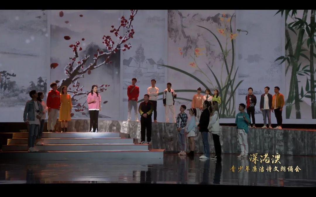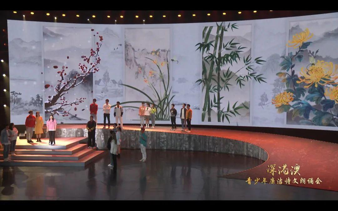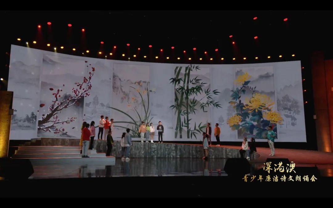 朗诵会节目《古诗集锦》便集中表现了对清正廉洁、公正为民的高尚精神追求,四首诗歌的朗诵形式别出心裁,以音效造景,如雨声、雪声、溪水潺潺之声,辅之以梅兰竹菊的条屏,带领观众沉浸式体验、立体式感受,同沐廉洁之风,共赏廉洁之韵。