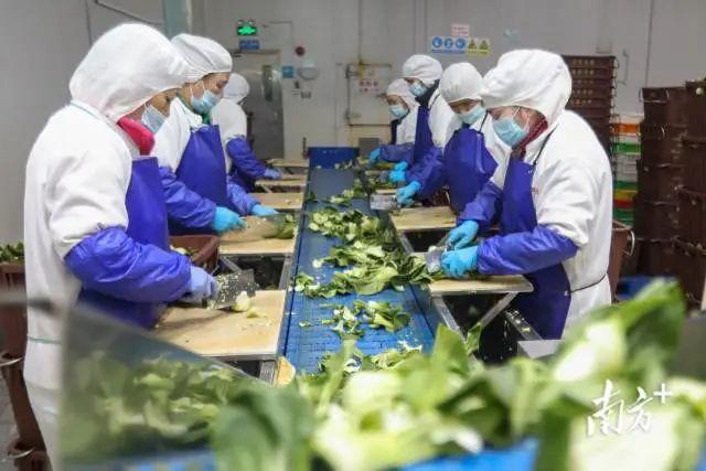 2月10日,在深圳市创利蔬果有限公司厂区门口,一辆辆装满西红柿、小白菜等新鲜蔬菜的货柜车正准备开往文锦渡口岸运往香港,干净整洁的车间内,工人们正在自动化流水线上马不停蹄地开展蔬菜加工作业。