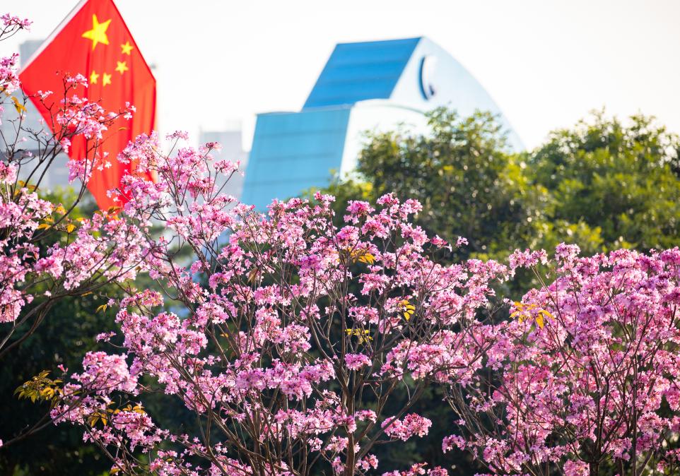 紫荆园位于前海国际会议中心旁,风景优美,紫荆花正盛开。紫荆园以香港特别行政区区花红花紫荆及深圳乡土树宫粉紫荆为主打品种,营造出花海叠翠、紫荆争艳的效果,寓意粤港澳深度合作示范区的共同繁荣。