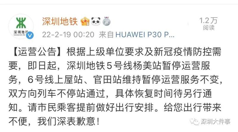根据上级单位要求及新冠疫情防控需要,即日起,深圳地铁5号线杨美站暂停运营服务,6号线上屋站、官田站维持暂停运营服务不变,双方向列车不停站通过,具体恢复时间待另行通知。请市民乘客提前做好出行安排。