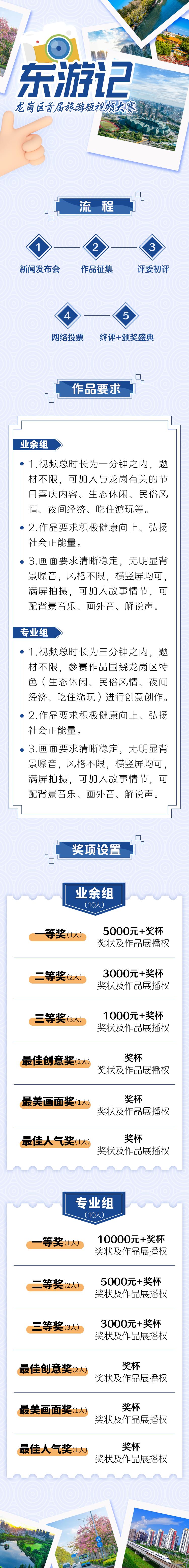 为深入学习贯彻习近平总书记关于文化和旅游融合发展重要论述精神,动员全区上下把握文化和旅游发展新机遇,推动文化和旅游深度融合、相互促进,激发新动能、形成新优势、实现新发展,全力打造文化旅游强区,龙岗区文化广电旅游体育局、龙岗区融媒集团举办“东游记——龙岗区首届旅游短视频大赛”。