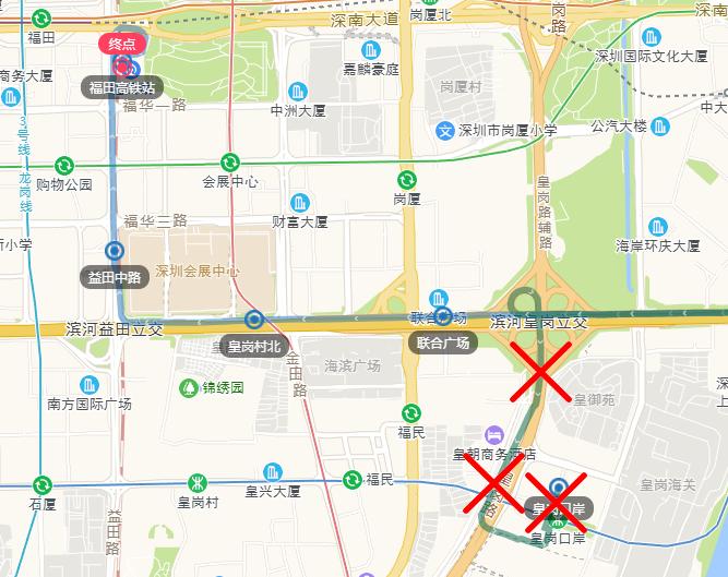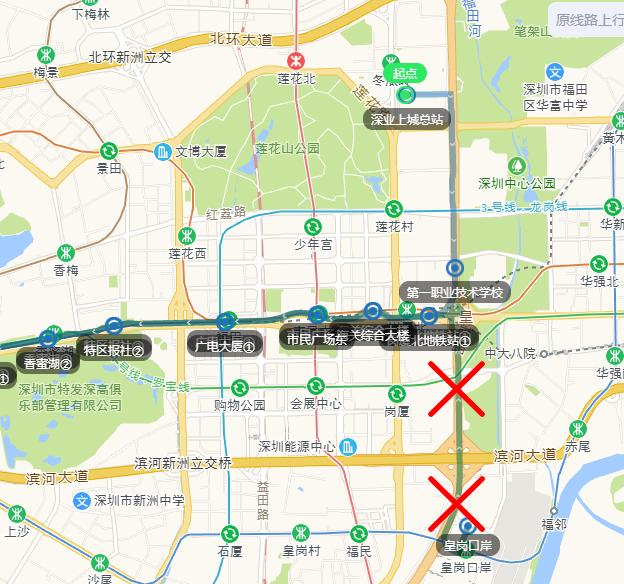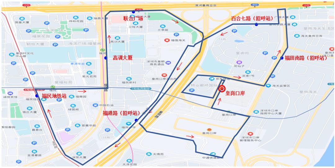 皇岗口岸、福田南路(招呼站)、百合七路(招呼站)、福港路(招呼站)、福民地铁站、高训大厦、联合广场、皇岗口岸