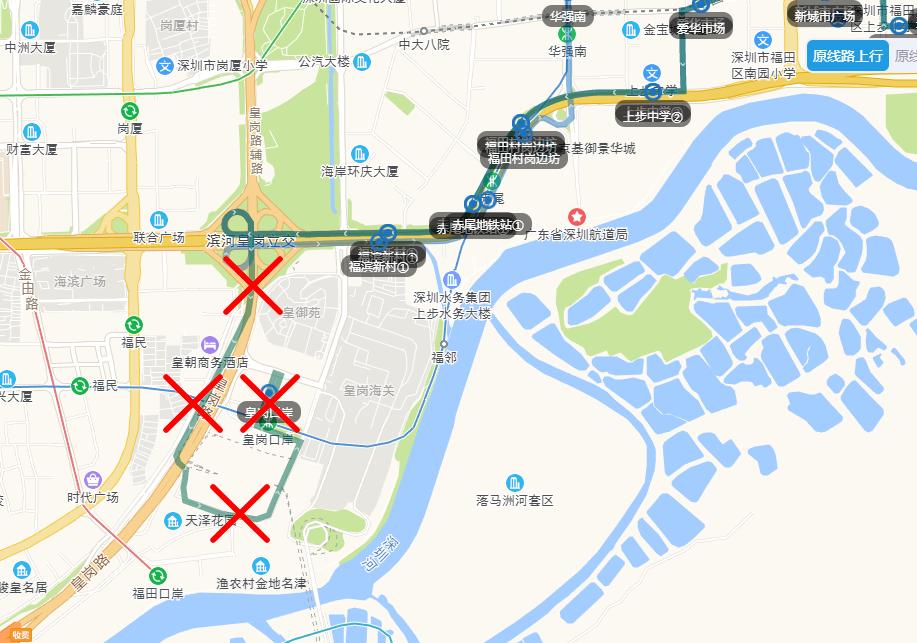 线路沿途停靠站点不变,车辆行驶至福滨新村站后,将在滨河皇岗立交桥折返。