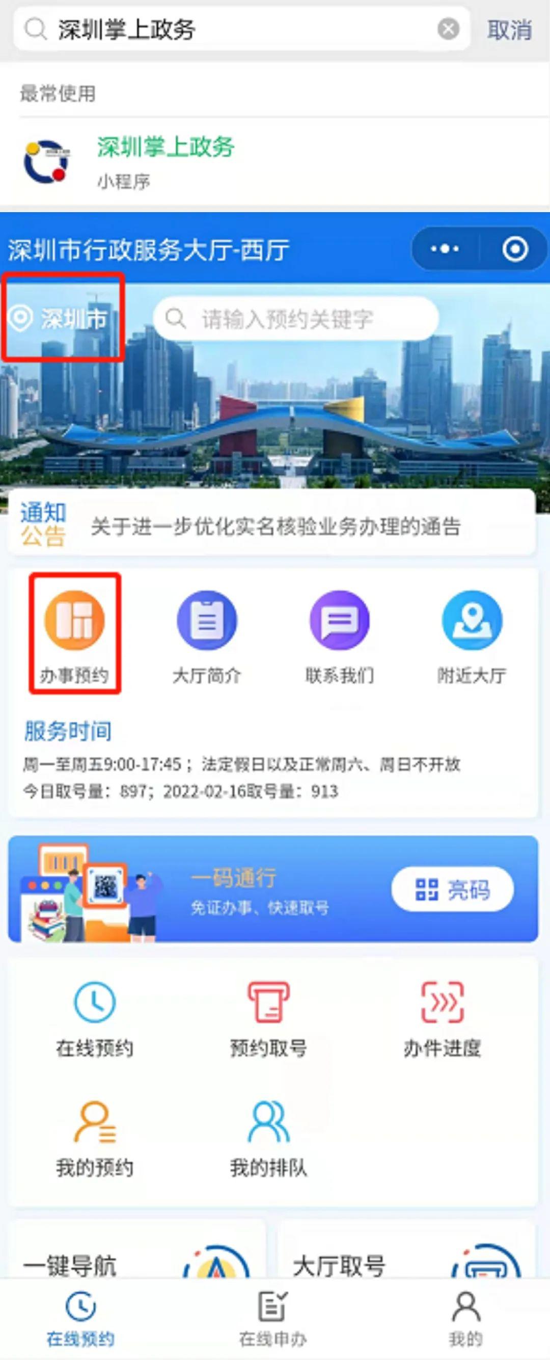 搜索“深圳掌上政务”小程序→【办事预约】或左上角【深圳市】→【深圳市行政服务大厅】。