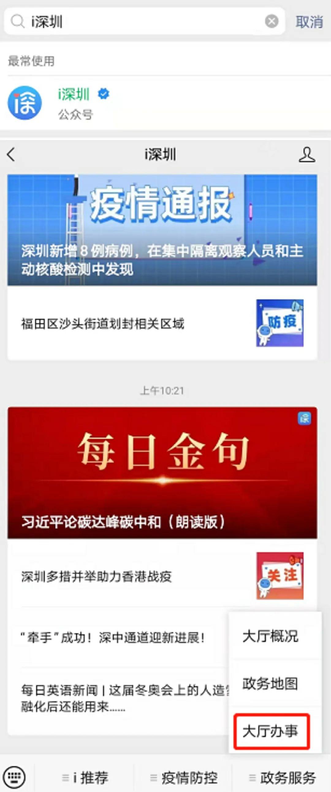 搜索“i深圳”微信公众号→【政务服务】→【大厅办事】→【办事预约】→【深圳市行政服务大厅】。