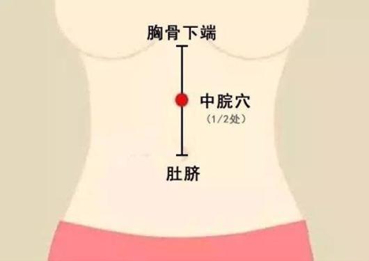 中脘:前正中线上,脐上4寸,前正中线上胸骨最下缘和肚脐连线中点处。